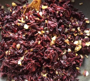 Step 2 – heat 2 tbsp oil in a large skillet; finely chop the onion and add to the pan, cook until soft and golden; finely mince the garlic and add it in with the onion, cook for 5 minutes on low heat; add the hibiscus flowers and stir to combine, add 2 tsp salt, 1/2 tsp pepper and cook for 10 minutes, stir to avoid burning them.