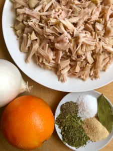 Step 2 – combine the orange juice, vegetable broth and liquid smoke, mix well and add to the browned jackfruit; cook until all liquid is absorbed about 8-10 minutes; add an additional 2 tbsp oil to the pan and allow the jackfruit to brown and become a bit crisp, stirring to avoid burning; taste and adjust seasoning if needed.