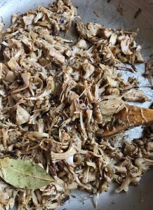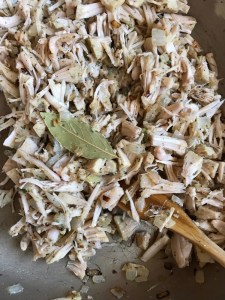 Step 1 – heat 2 tbsp oil in a non stick pan, add in diced onion and cook until golden brown; mix in the shredded jackfruit and saute for 10 minutes, stirring constantly to avoid burning; add the bay leaf, marjoram, oregano, garlic powder, 1 tsp salt and 1/2 tsp pepper; cook an additional 10-12 minutes until jackfruit is lightly browned.